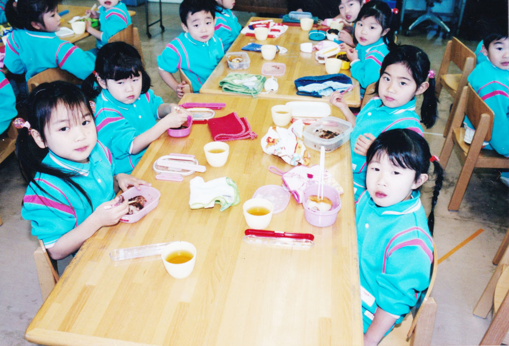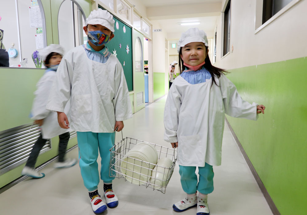 年中年長さんは1週間毎に交代で行うお当番さんが白衣を着て小学生のように給食のお皿等を運んだり片付けをしたりします。